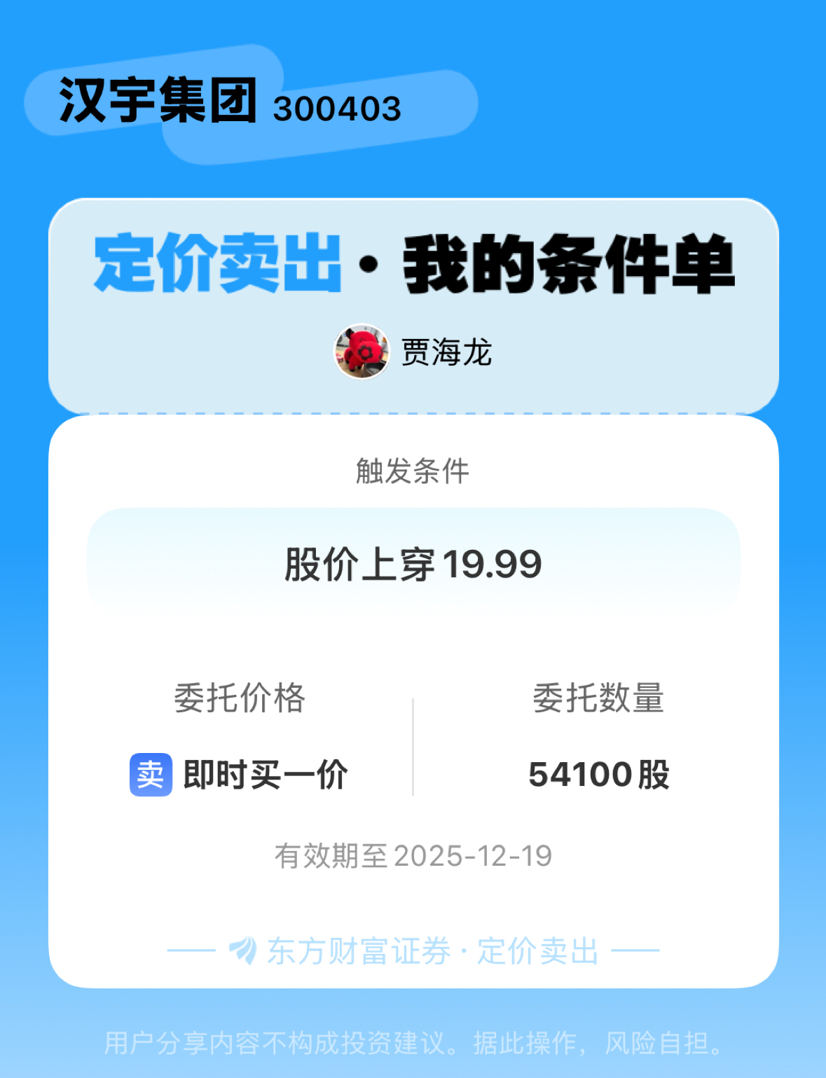 #条件单交流# #定价卖出晒单# 一位股神设置了一个定价卖出条件单,接下来就是见证奇迹的时刻~$汉宇集团(SZ300403)$