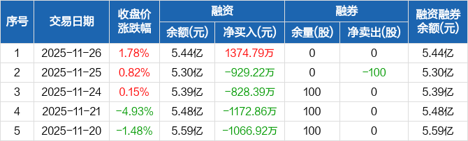 汉宇集团:融资净买入1374.79万元,融资余额5.44亿元(11-26)