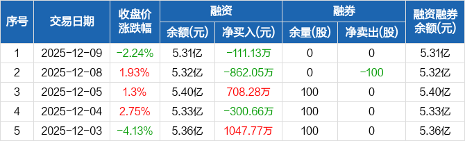 汉宇集团:融资净偿还111.13万元,融资余额5.31亿元(12-09)