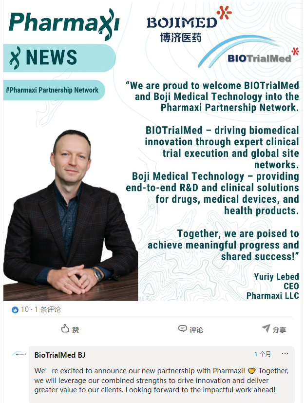 目前,三方已完成前期协作准备,Pharmaxi官网“现有合作伙伴(CRO)”板块已正式上线博济医药及旗下BlOTrialMed的企业信息与服务能力,并在LinkedIn平台发布官宣内容,同步扩大合作影响力。