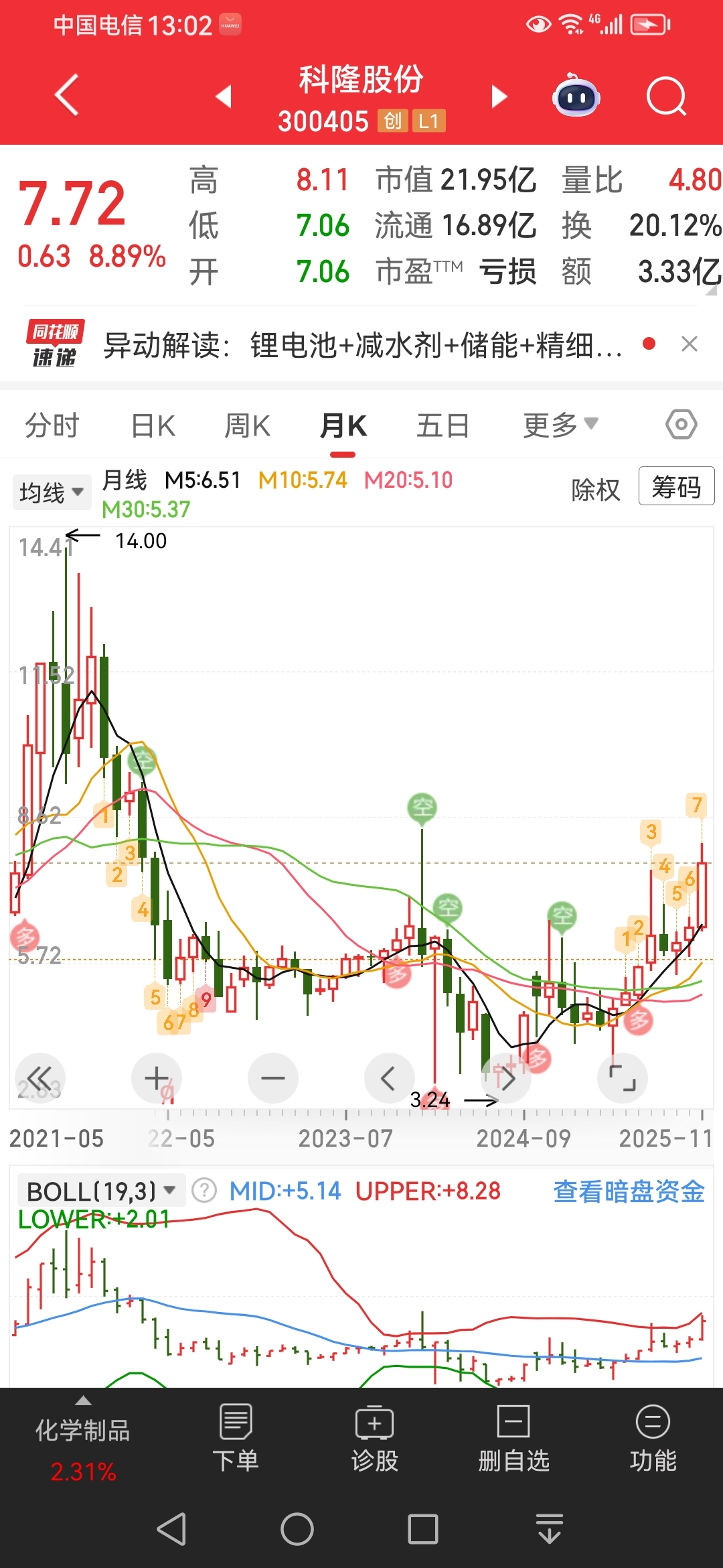 $科隆股份(SZ300405)$ 能涨到 21年的 14元吗?