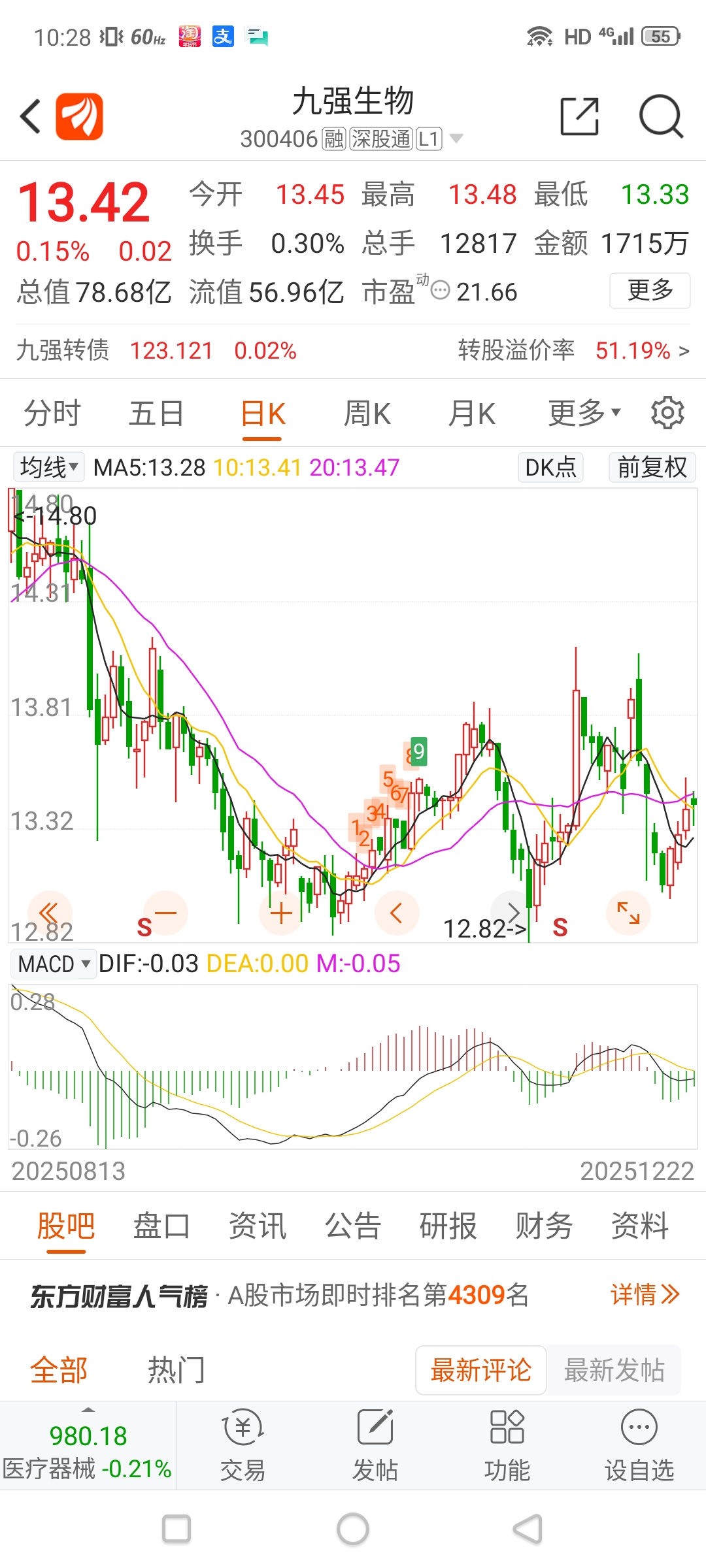 $九强生物(SZ300406)$ 三重底了,跌不下去的,上涨只是时间的问题而已,耐性持有即可。
