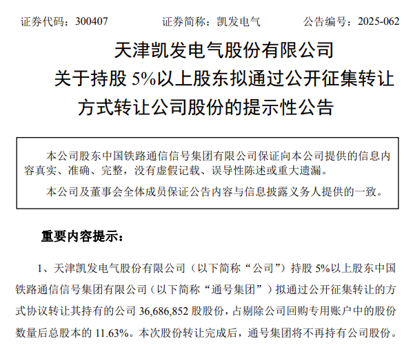 凯发电气11月25日晚间公告称,持股5%以上股东中国铁路通信信号集团有限公司(简称“通号集团”)拟通过公开征集转让的方式协议转让其持有的公司3668.69万股股份,占剔除公司回购专用账户中的股份数量后总股本的11.63%。