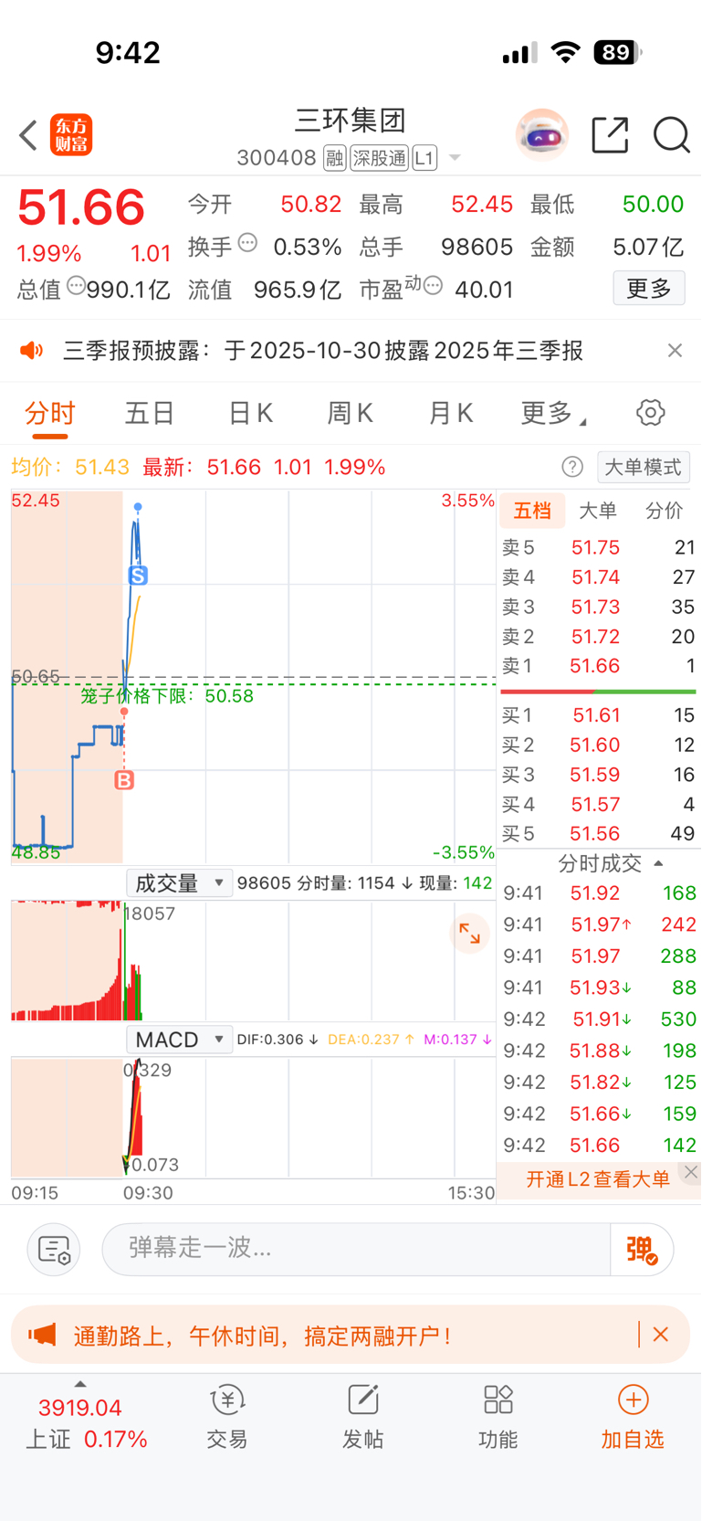 $三环集团(SZ300408)$ 心不贪,50.35买,52.35卖,成本降低2块