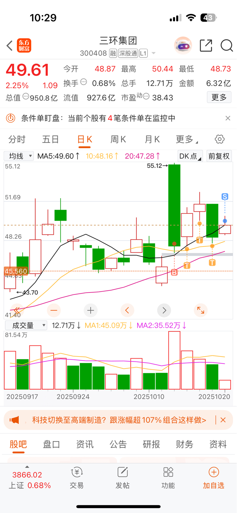 $三环集团(SZ300408)$ 减了四分之一的仓位,目前成本45.5,浮盈8.8%
