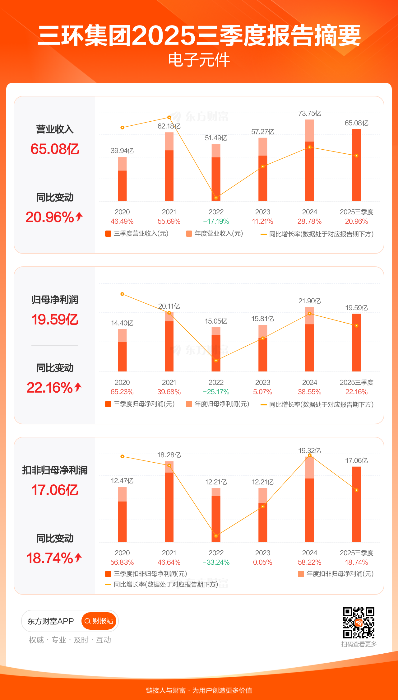 三环集团10月30日发布2025年三季报显示,公司前三季实现营业收入65.08亿元,同比增长20.96%;归母净利润19.59亿元,同比增长22.16%;扣非归母净利润17.06亿元,同比增长18.74%。