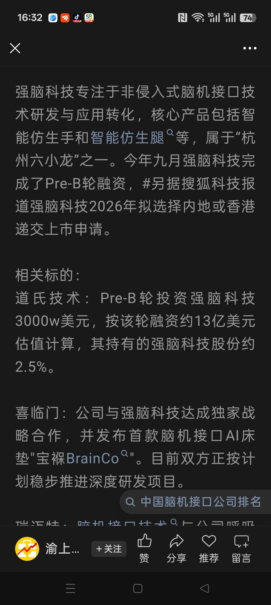 $道氏技术(SZ300409)$ 强脑科技3000万美元