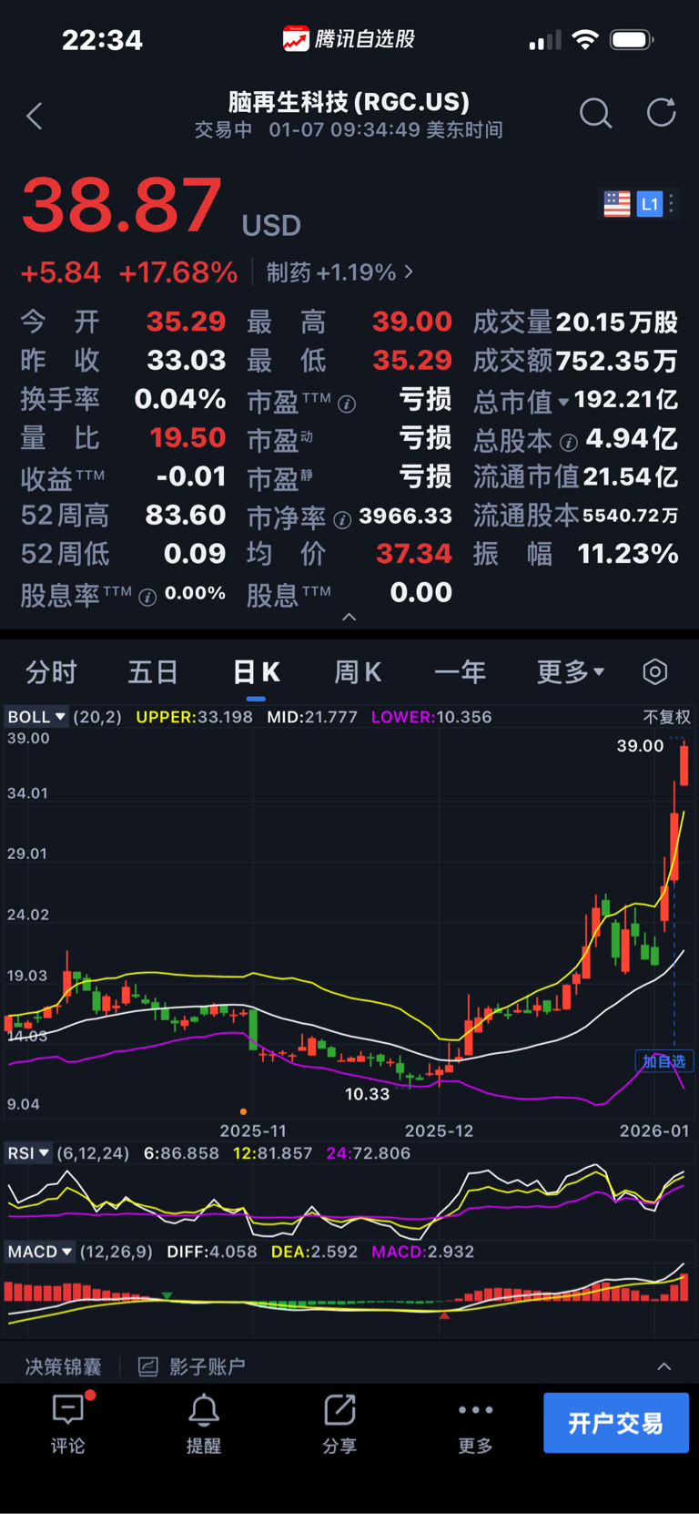$道氏技术(SZ300409)$ 美股脑再生科技继续暴涨。