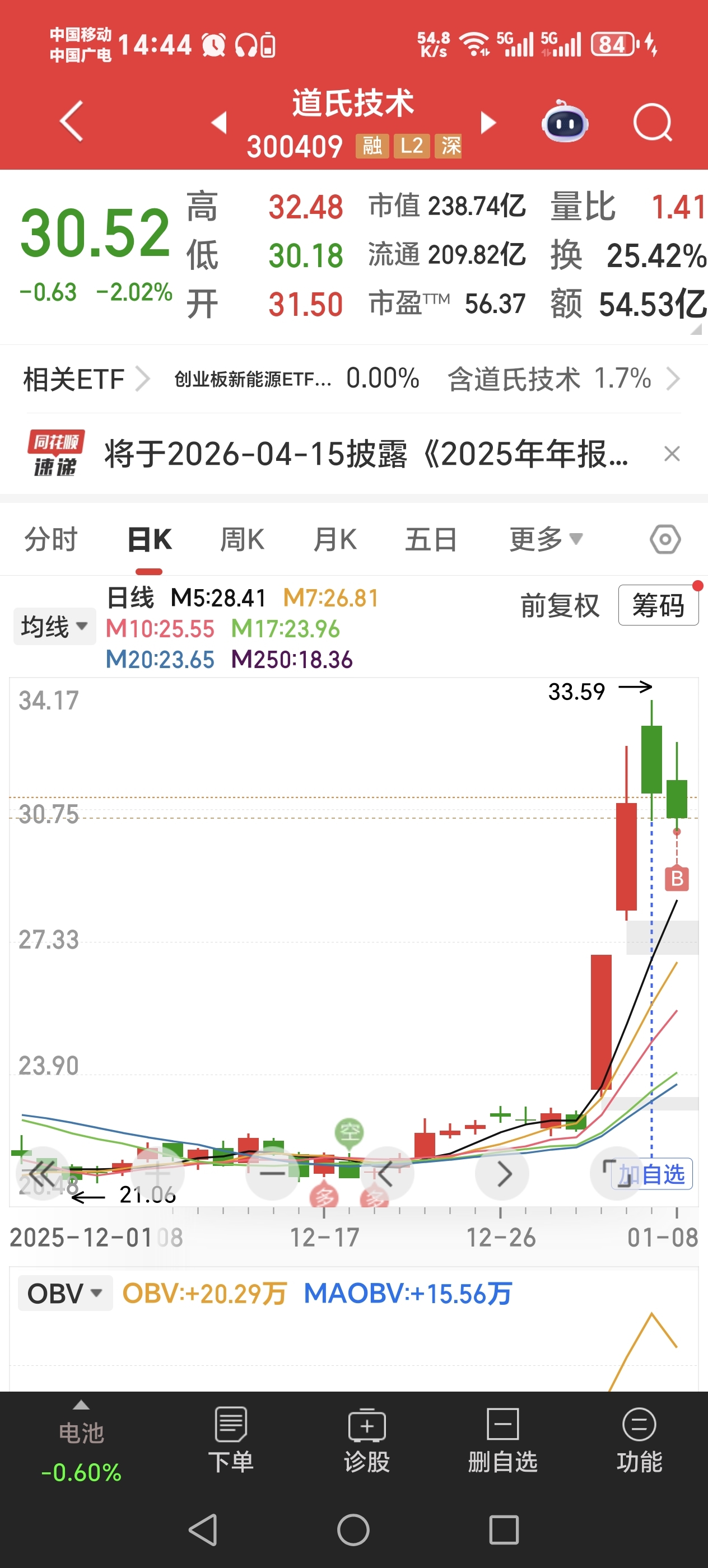 $道氏技术(SZ300409)$ 30.5拿了点,一切交给市场