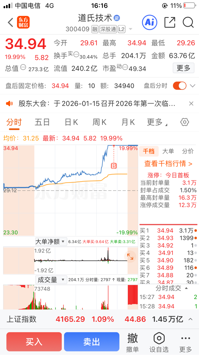$道氏技术(SZ300409)$ 打板进的,应该是余哥拉板