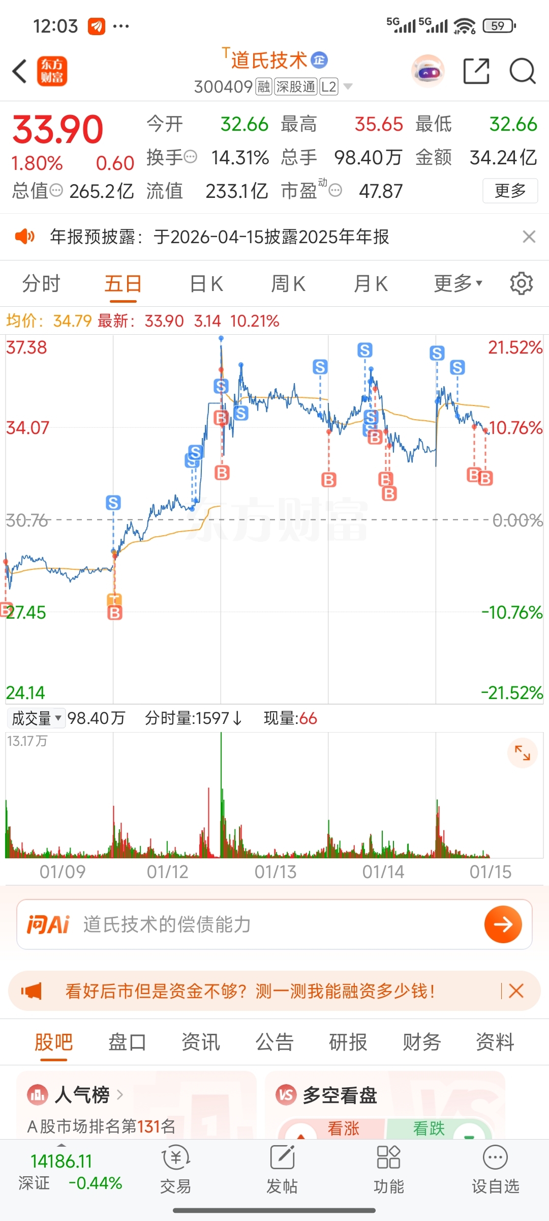 $道氏技术(SZ300409)$ 每天都T一下次,等一个新高,暂时不放弃。