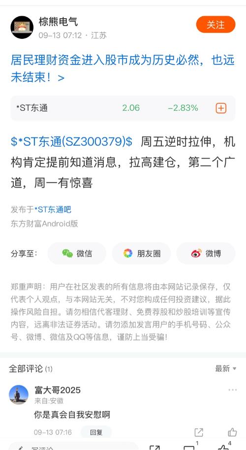 温馨提示: 1.根据《证券法》规定,禁止编造、传播虚假信息或者误导性信息,扰乱证券市场;2.用户在本社区发表的所有资料、言论等仅代表个人观点,与本网站立场无关,不对您构成任何投资建议。用户应基于自己的独立判断,自行决定证券投资并承担相应风险。《东方财富社区管理规定》