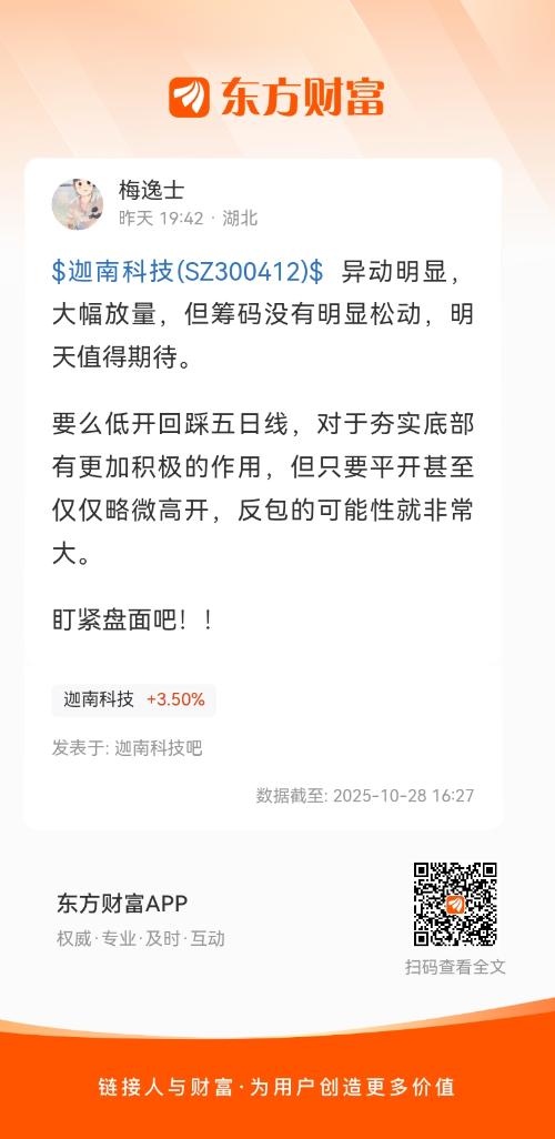 $迦南科技(SZ300412)$ 异动明显,大幅放量,但筹码没有明显松动,明天值得期待。