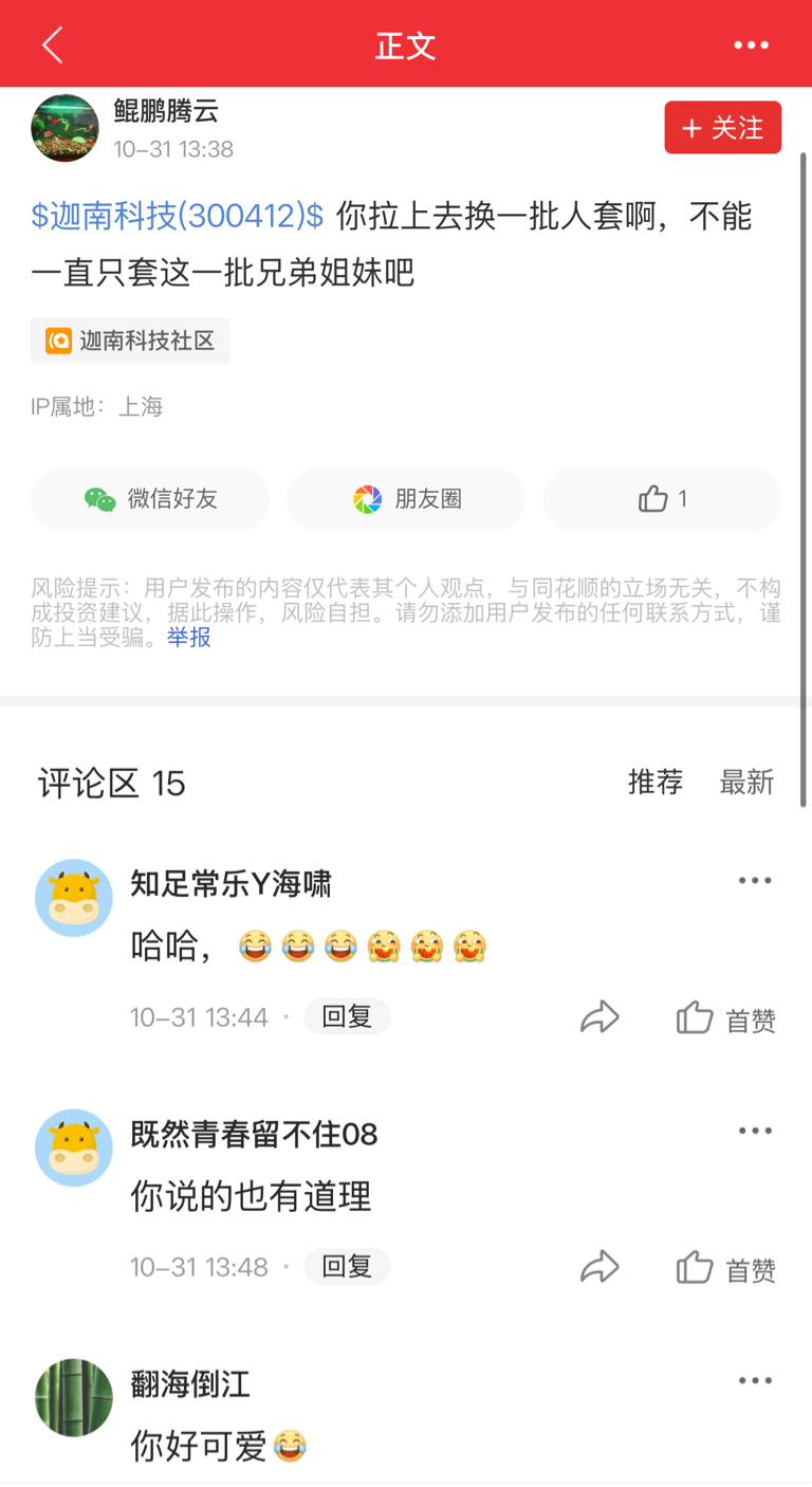 温馨提示: 1.根据《证券法》规定,禁止编造、传播虚假信息或者误导性信息,扰乱证券市场;2.用户在本社区发表的所有资料、言论等仅代表个人观点,与本网站立场无关,不对您构成任何投资建议。用户应基于自己的独立判断,自行决定证券投资并承担相应风险。《东方财富社区管理规定》