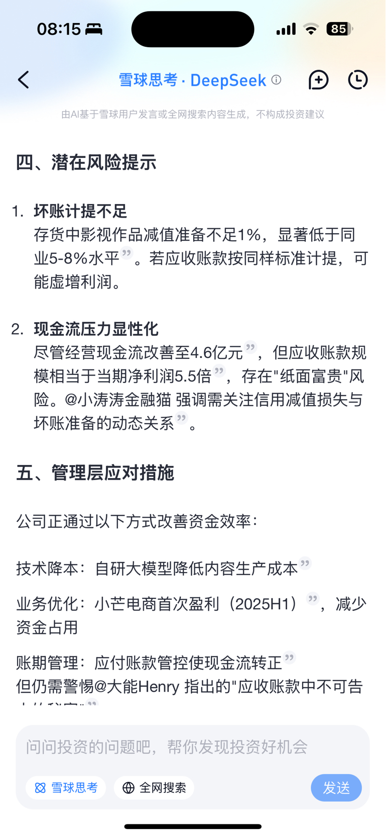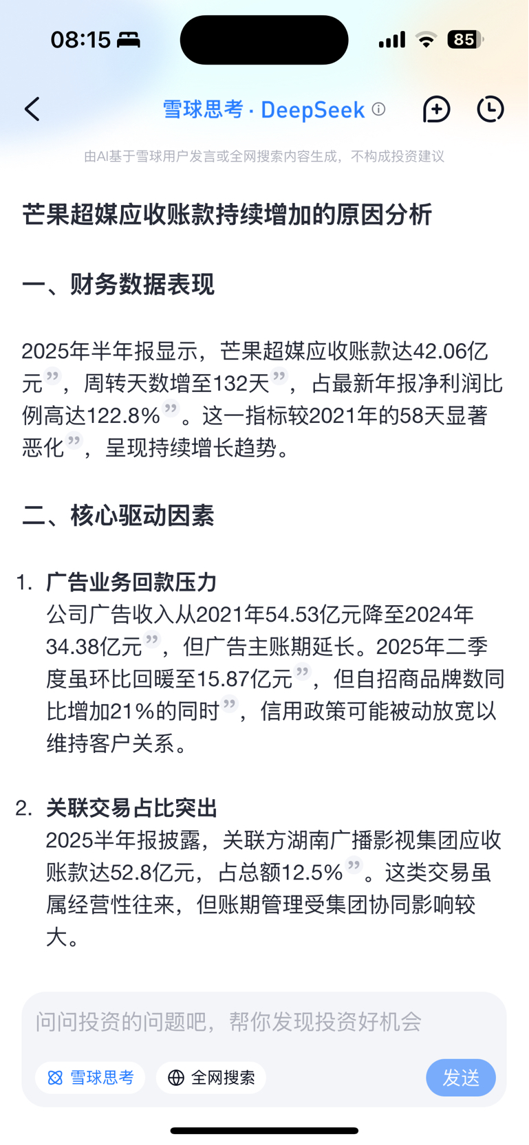 $芒果超媒(SZ300413)$ 一屁股烂账收不回来。浅显分析,结合deepseek:25年应收帐款高达42亿,24年年报中这些烂账居然还有超过5年的。什么性质的公司这么多钱不要了就不要了,23年5年以上账期才4800多万,24年就1.2亿了,坏账翻了快三倍。