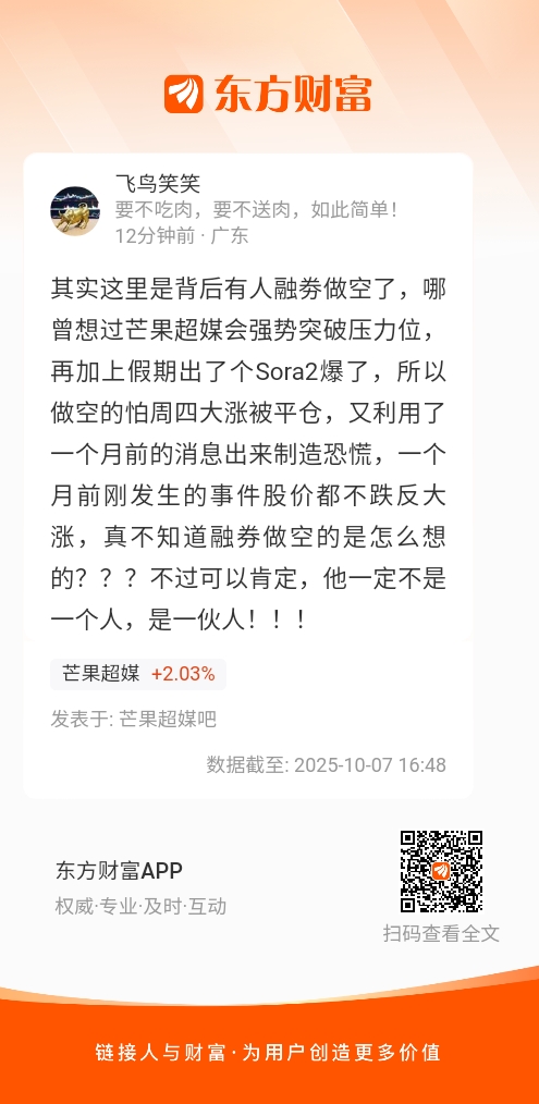 其实这里是背后有人融劵做空了,哪曾想过芒果超媒会强势突破压力位,再加上假期出了个Sora2爆了,所以做空的怕周四大涨被平仓,又利用了一个月前的消息出来制造恐慌,一个月前刚发生的事件股价都不跌反大涨,真不知道融券做空的是怎么想的???不过可以肯定,他一定不是一个人,是一伙人!!!