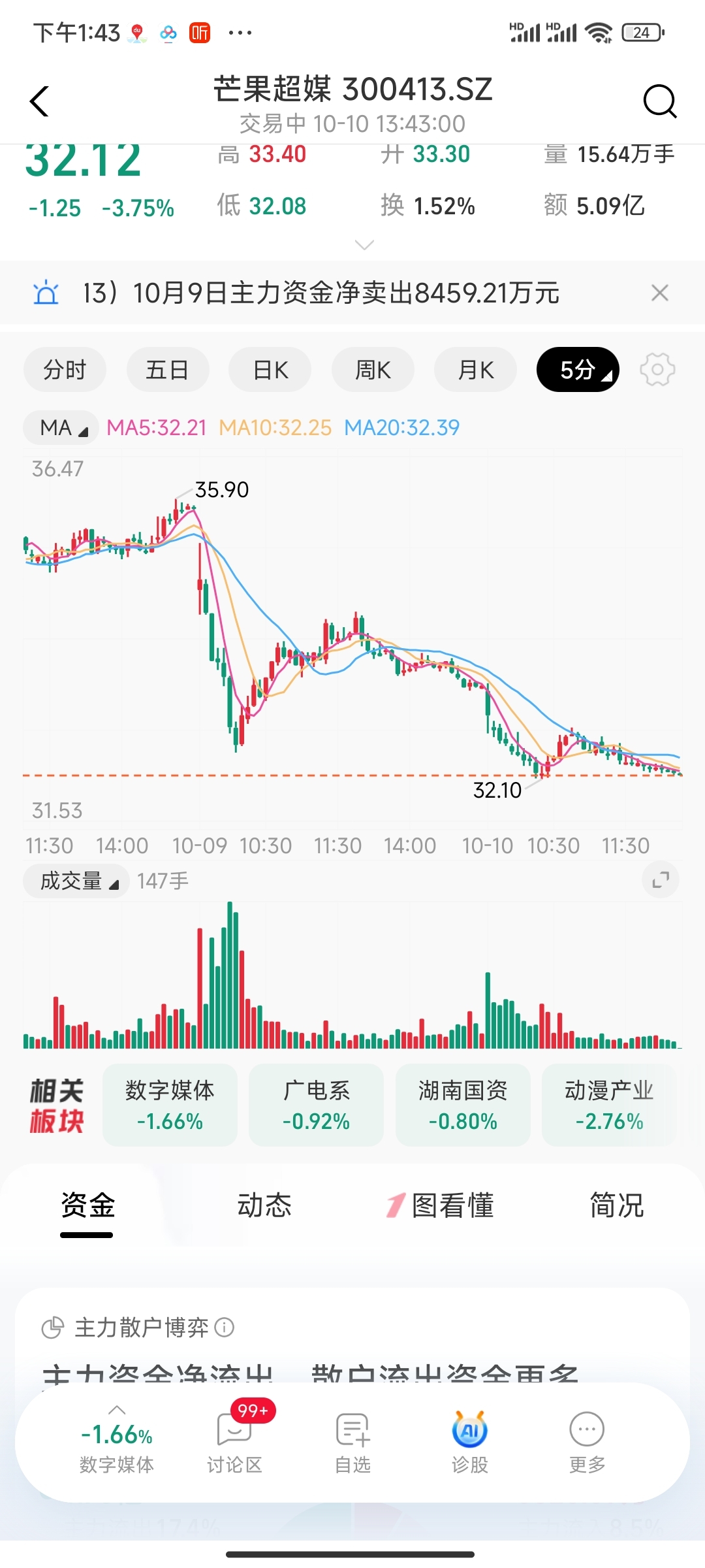 $芒果超媒(SZ300413)$ 看这两天的趋势,都是开盘猛跌,上午10:30开始拉伸,然后在一个点位拉扯。直觉有部分资金或散户“获救”了