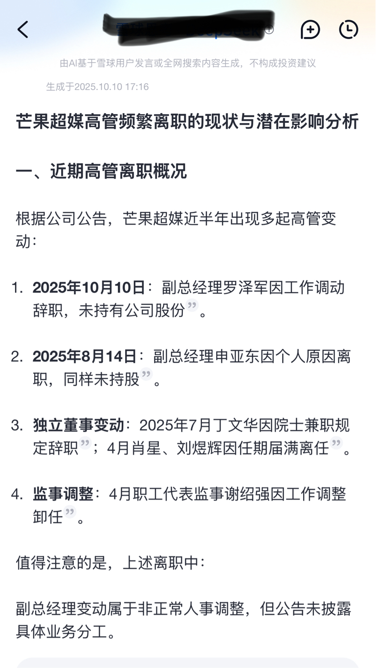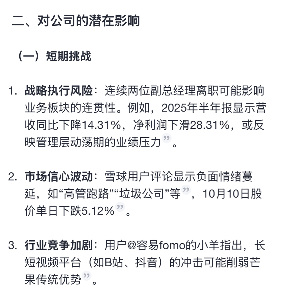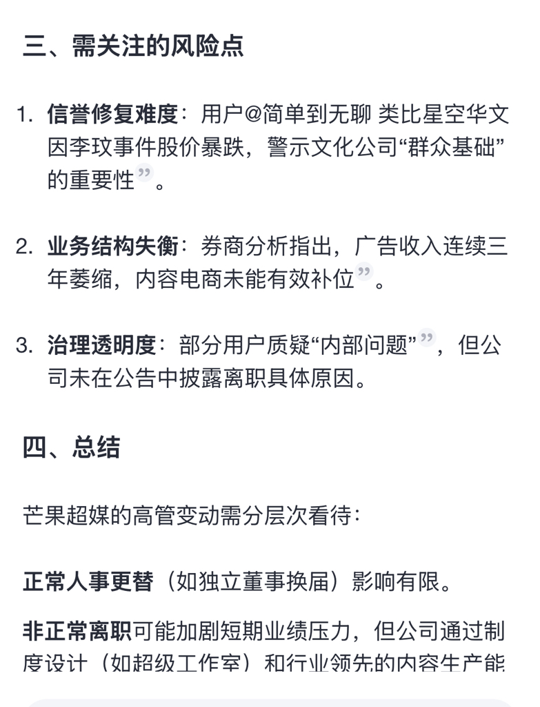 $芒果超媒(SZ300413)$ 担心问了问deepseek,还是小心谨慎点好。高管频频跑路上半年收入下滑严重。