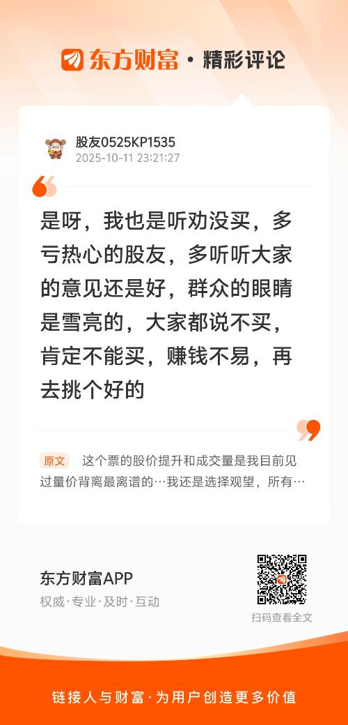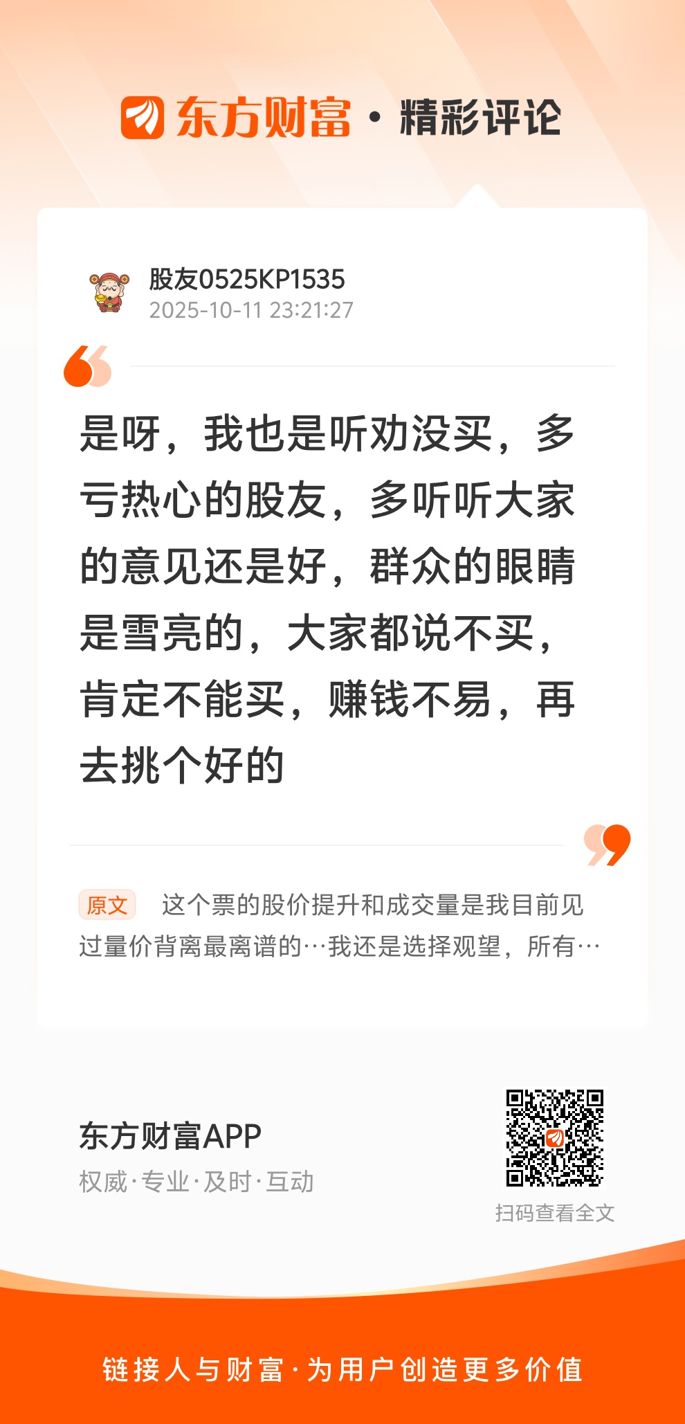 是呀,我也是听劝没买,多亏热心的股友,多听听大家的意见还是好,群众的眼睛是雪亮的,大家都说不买,肯定不能买,赚钱不易,再去挑个好的 我在《这个票的股价提升和成交量是我目前见过量价背离最离谱的…我还是选择观望,所有的舆论》的评论获得了大家的关注。