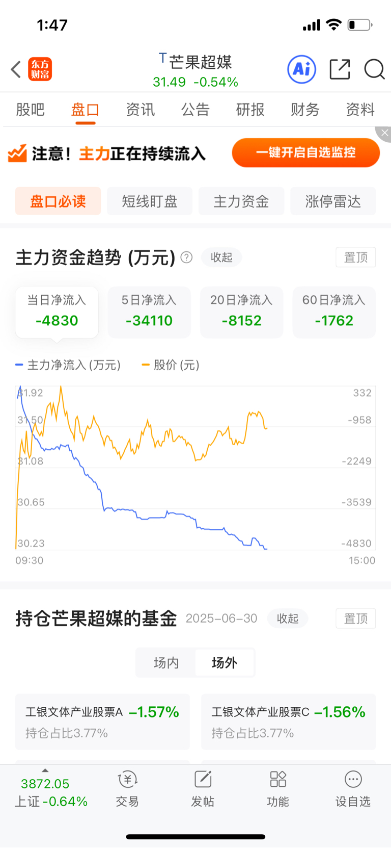 $芒果超媒(SZ300413)$ 怎么资金天天都在流出,跑不完的吗