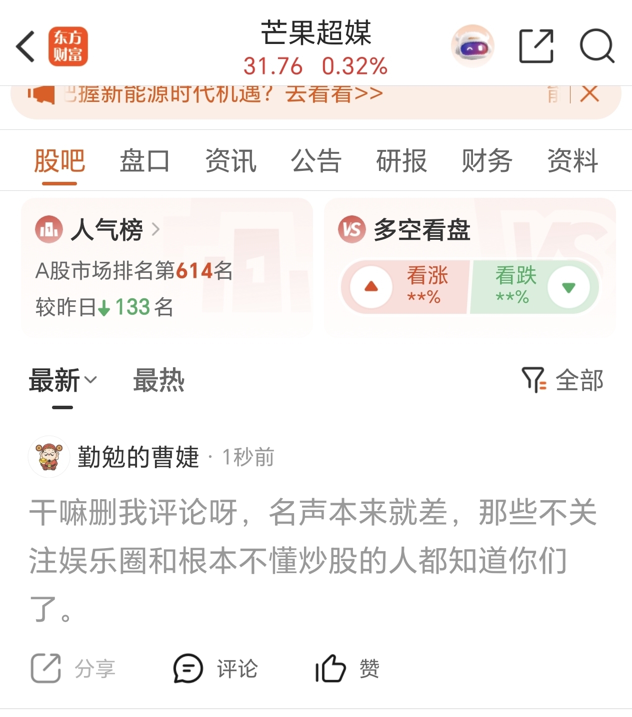 $芒果超媒(SZ300413)$ 哎呀,好气啊,不让人说话,我就是那个不懂炒股,也不关注娱乐的人,我最近可没少听你们那些乱七八糟新闻,都满天飞了。