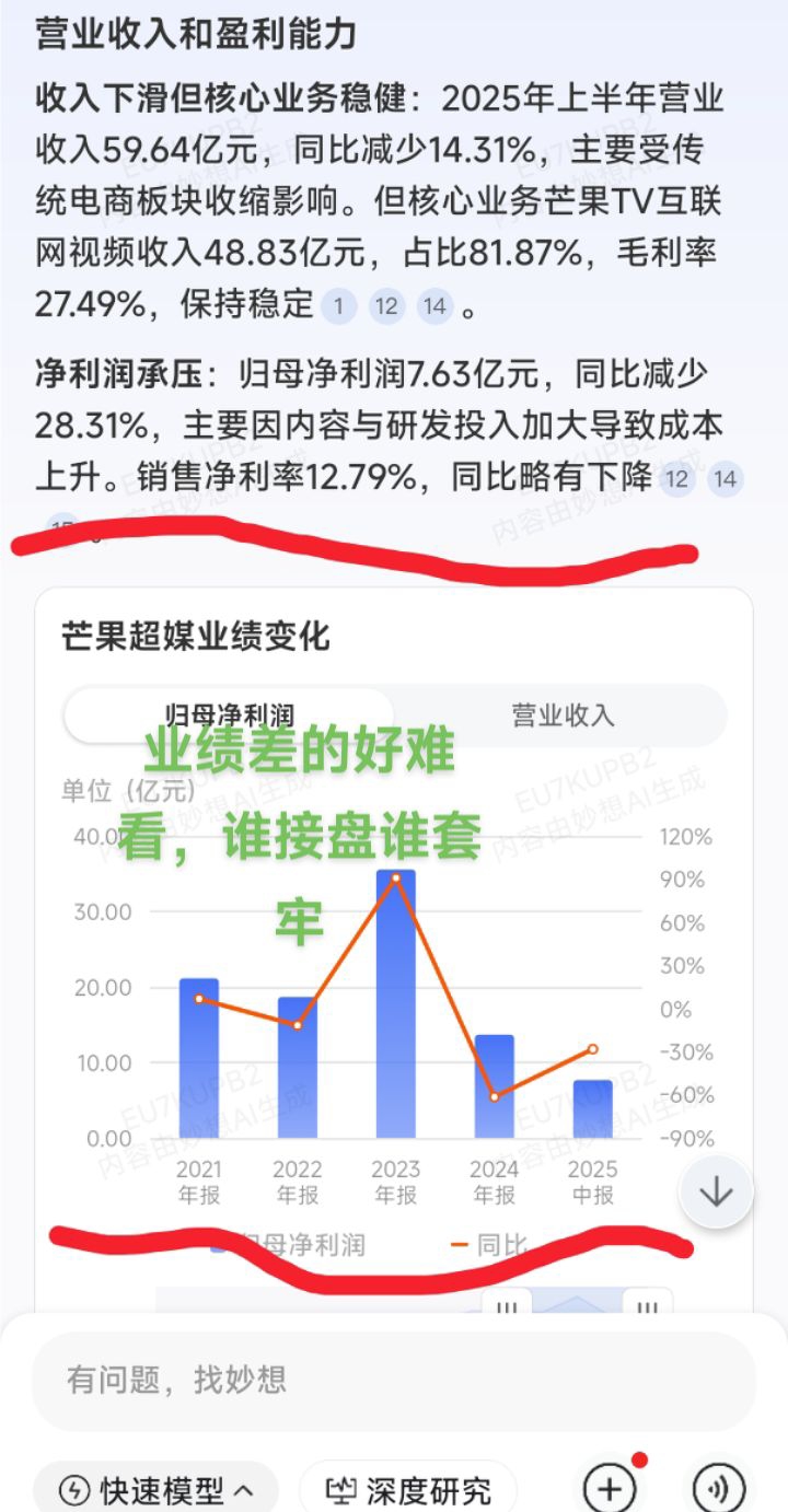 $芒果超媒(SZ300413)$ 业绩不断的降,现在都刷抖音,小红薯,看短剧,对传统媒体真是挑战啊!