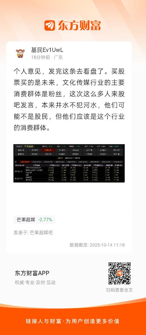 个人意见,发完这条去看盘了。买股票买的是未来,文化传媒行业的主要消费群体是粉丝,这次这么多人来股吧发言,本来井水不犯河水,他们可能不是股民,但他们应该是这个行业的消费群体。