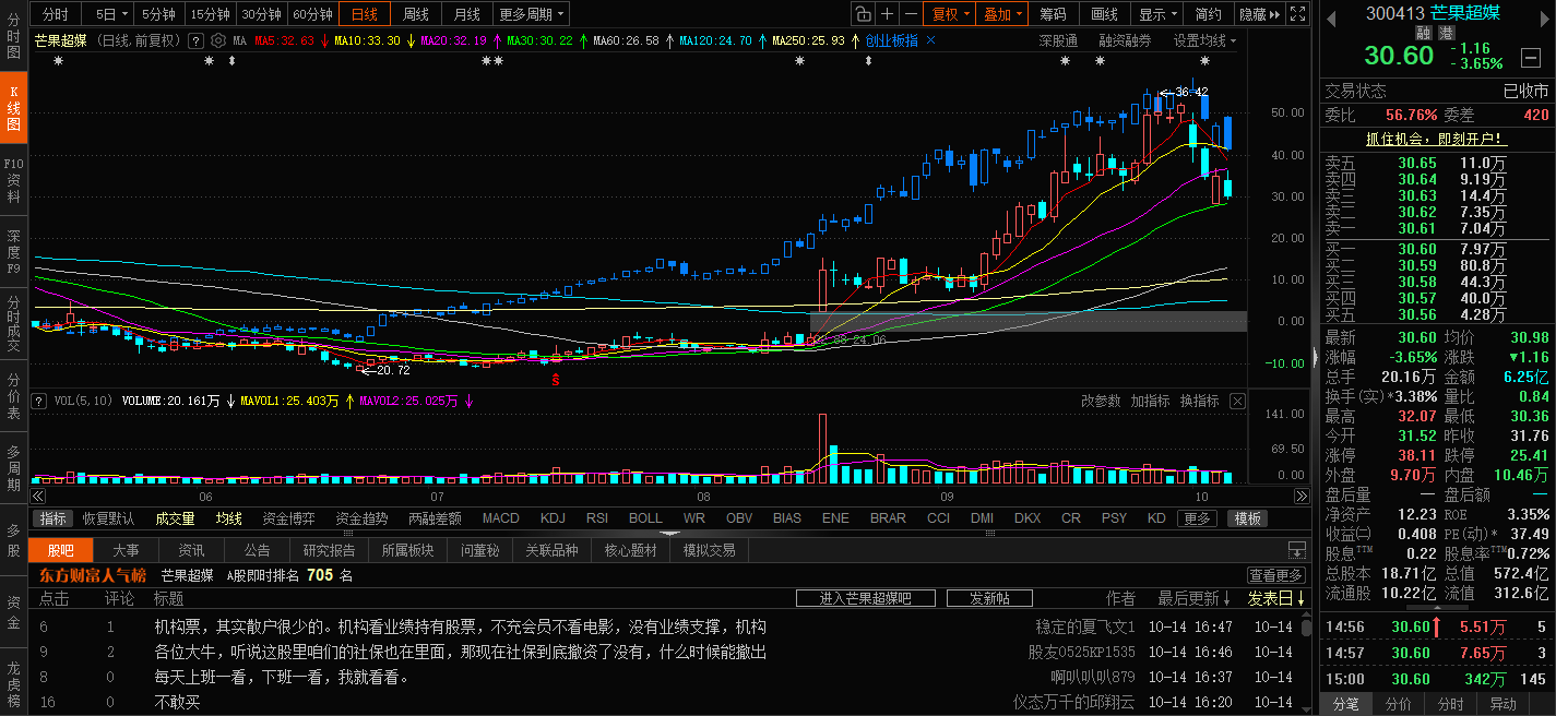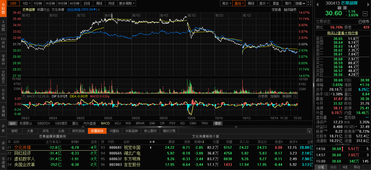 芒果超媒走势完全与创业板指数同步,没必要听信谣言,股市有自己本省运行的规律和内在逻辑,如果一众娱乐粉就可以将一家国企干掉,那只能说明公司质地不好,公司的好坏要看其本质能否创造超额利润,而不是一厢情愿的主管唾骂,你再怎么唾骂中国石油,中国移动,他们都是垄断地位,不耽误赚钱,你再怎么黑芒果超媒,他都是传媒行业的佼佼者,不单位他公司本身质地转好,不耽误他出海走向全球的战略目标。