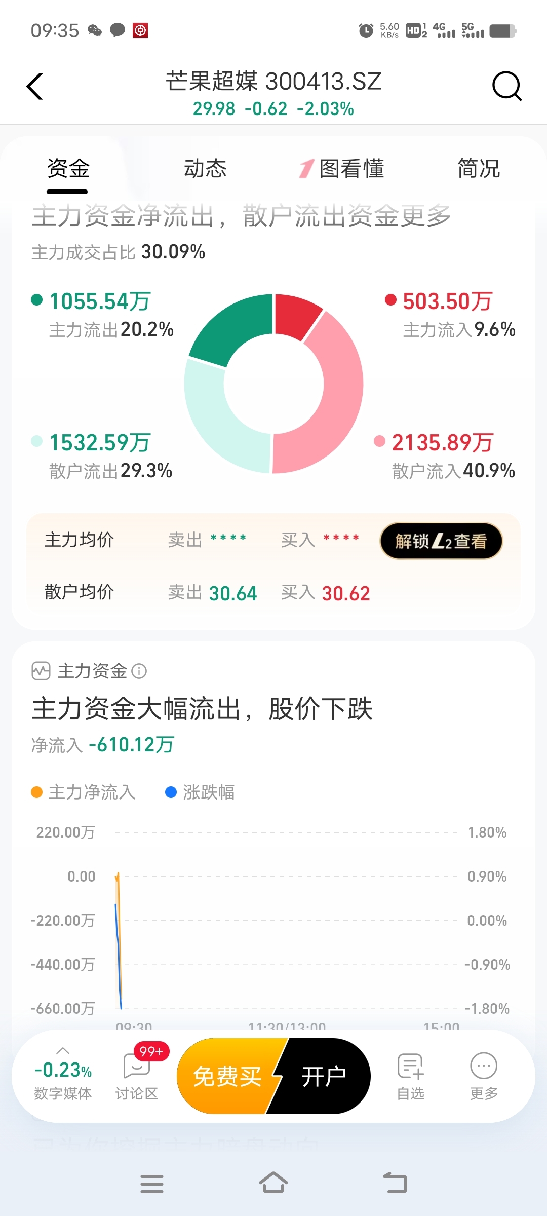 $芒果超媒(SZ300413)$ 开盘跟昨天一样的操作,跑的全是主力。谁知道进来的是真散还是伥鬼。还在唱多的真是在作孽