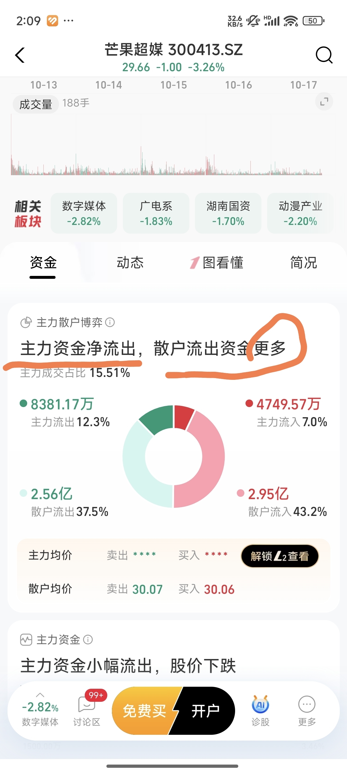$芒果超媒(SZ300413)$ 话不多说!!看图!!其实该股每天的走势都差不多,每天在盘中进行诱多,然后坑杀,主力资金持续流出,这么些天来,从来没变过,一直这样。