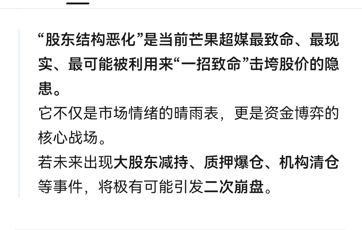 “股东结构恶化”是当前芒果超媒最致命、最现实、最可能被利用来“一招致命”击垮股价