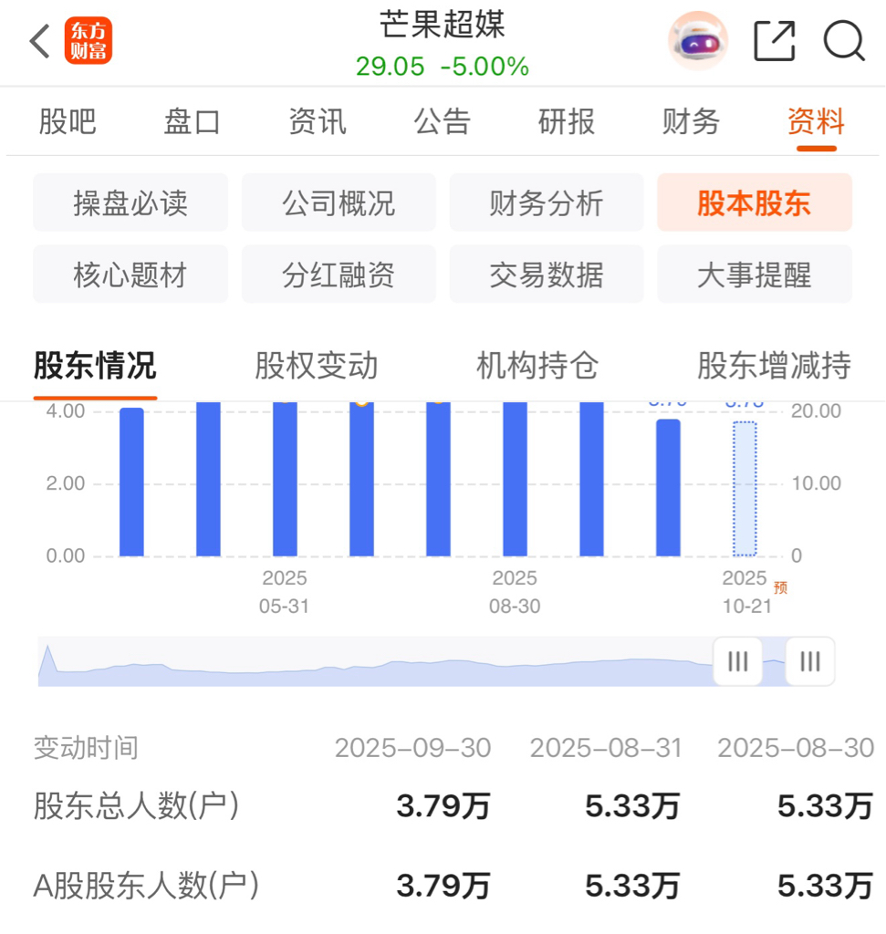 $芒果超媒(SZ300413)$ 一个月股东数竟然少了1.54万呢