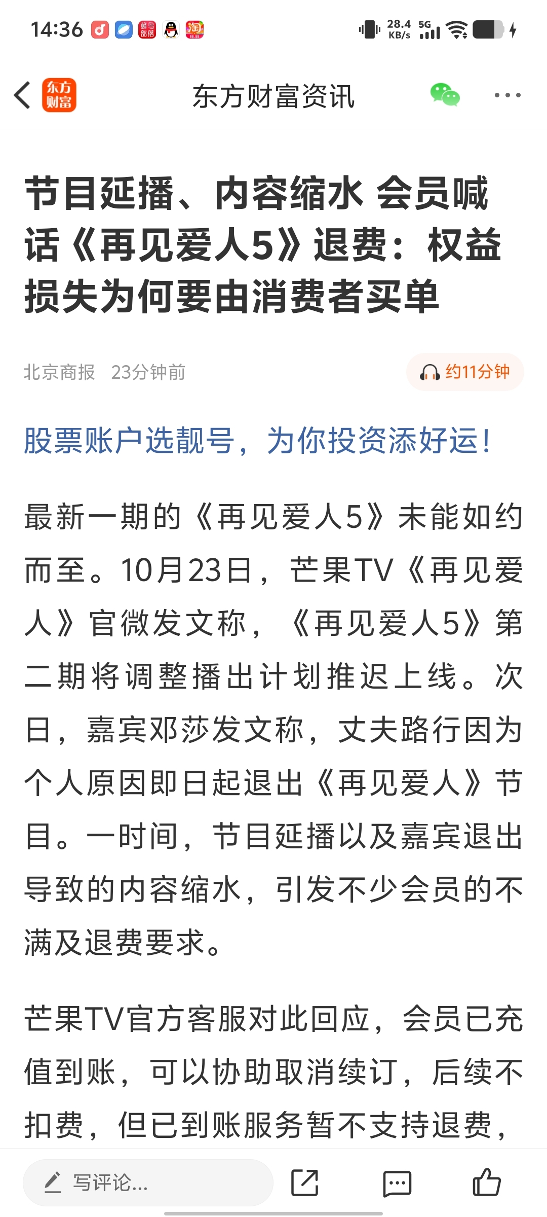 $芒果超媒(SZ300413)$ 会员要求退钱了诶,对股市有没有影响? 影响有多大?