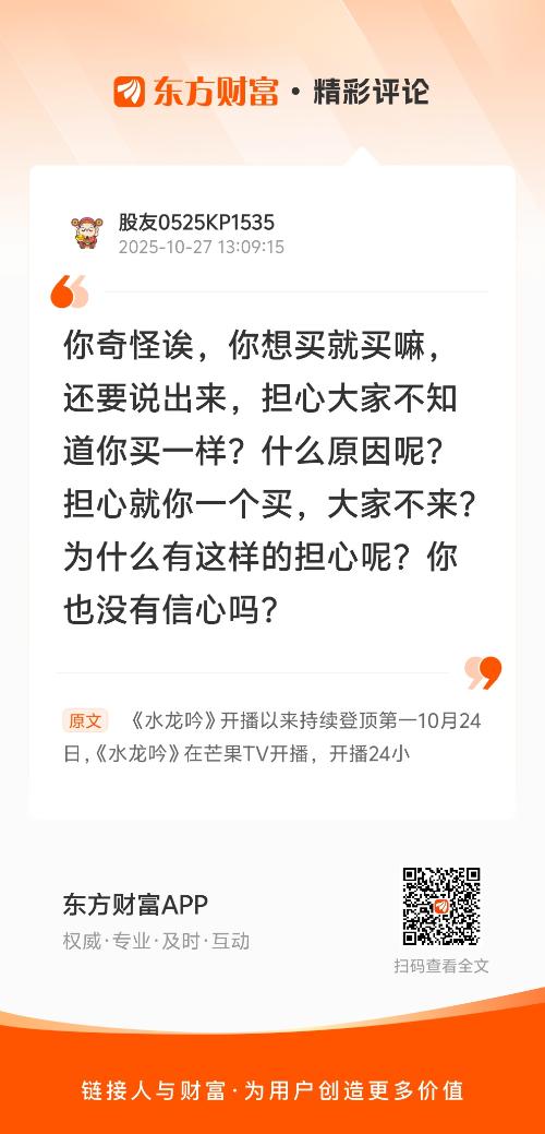 你奇怪诶,你想买就买嘛,还要说出来,担心大家不知道你买一样?什么原因呢?担心就你一个买,大家不来?为什么有这样的担心呢?你也没有信心吗? 我在《《水龙吟》开播以来持续登顶第一10月24日,《水龙吟》在芒果TV开播,开播24小》的评论获得了大家的关注。