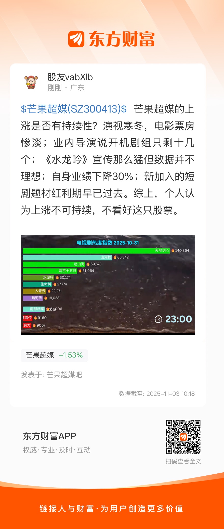 $芒果超媒(SZ300413)$ 芒果超媒的上涨是否有持续性?演视寒冬,电影票房惨淡;业内导演说开机剧组只剩十几个;《水龙吟》宣传那么猛但数据并不理想;自身业绩下降30%;新加入的短剧题材红利期早已过去。综上,个人认为上涨不可持续,不看好这只股票。