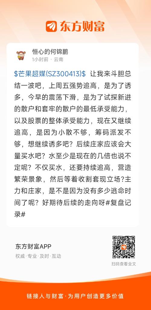 $芒果超媒(SZ300413)$ 让我来斗胆总结一波吧,上周五强势追高,是为了诱多,今早的震荡下滑,是为了试探新进的散户和套牢的散户的最低承受能力,以及股票的整体承受能力,现在又继续追高,是因为小散不够,筹码派发不够,想继续诱多吧?后续庄家应该会大量买水吧?水至少是现在的几倍也说不定呢?不仅买水,还要持续追高,营造繁荣景象,然后等着收割套现立场?主力和庄家,是不是因为没有多少逃命时间了呢?好期待后续的走向呀#复盘记录#