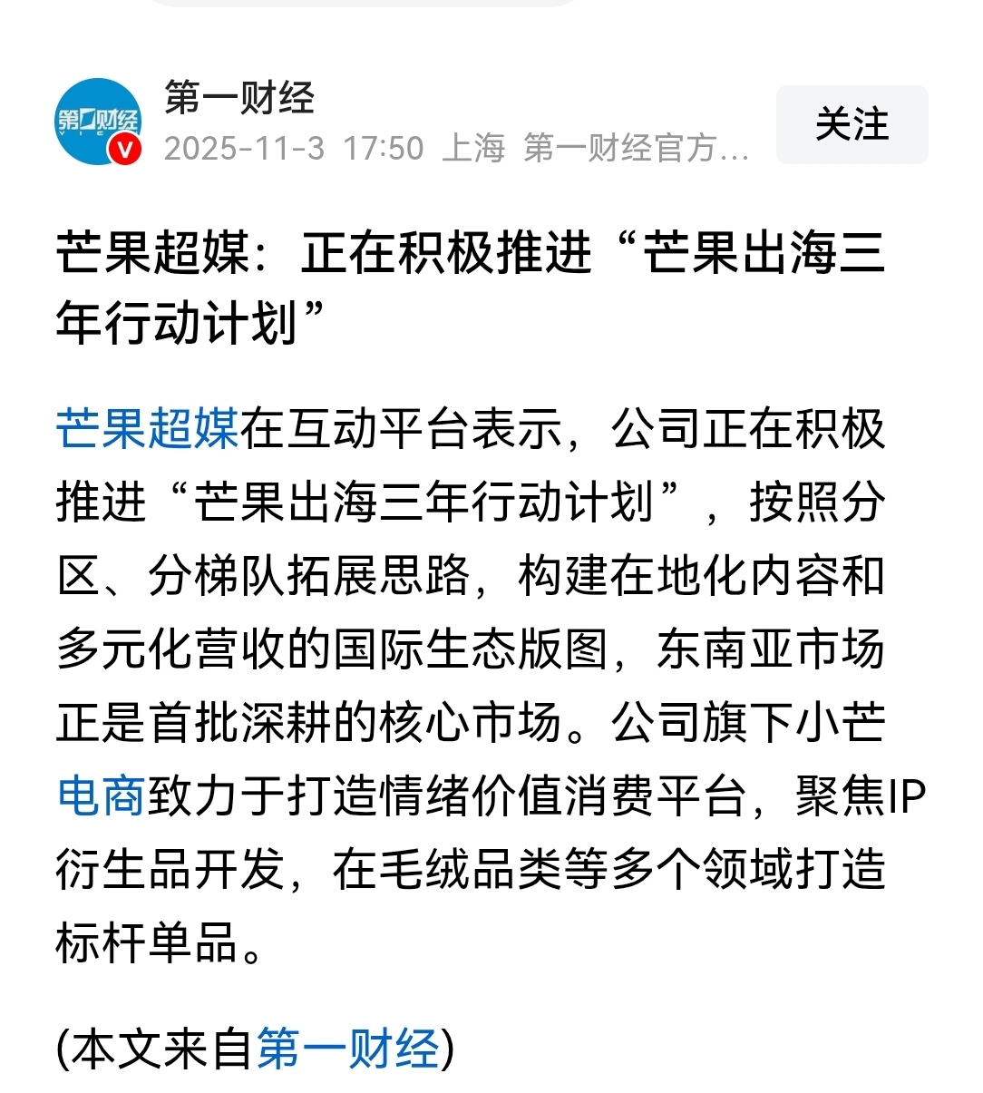 $芒果超媒(SZ300413)$ 芒果要出国了,大家说说是利还是空。