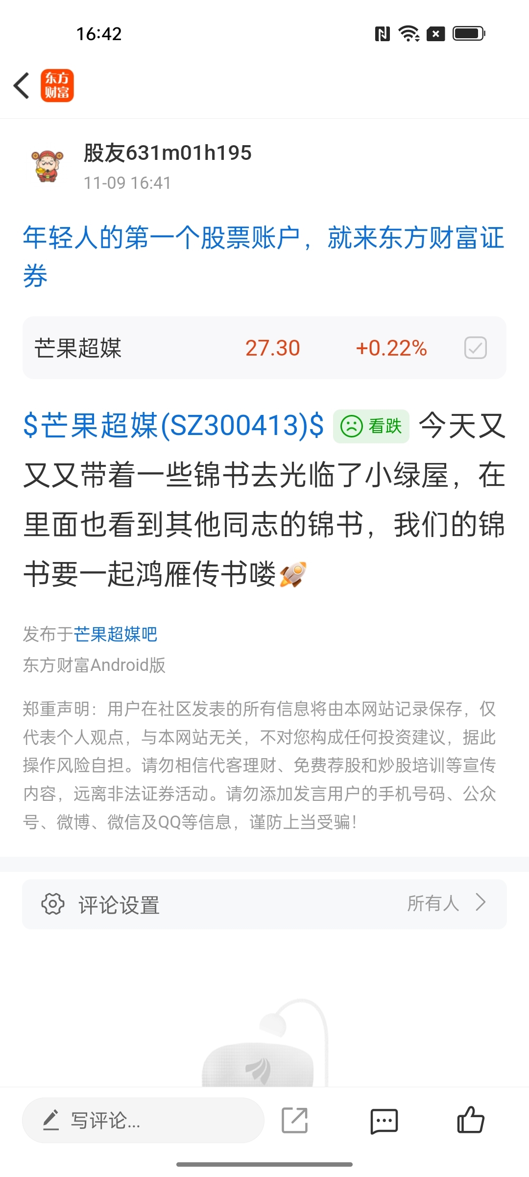 温馨提示: 1.根据《证券法》规定,禁止编造、传播虚假信息或者误导性信息,扰乱证券市场;2.用户在本社区发表的所有资料、言论等仅代表个人观点,与本网站立场无关,不对您构成任何投资建议。用户应基于自己的独立判断,自行决定证券投资并承担相应风险。《东方财富社区管理规定》