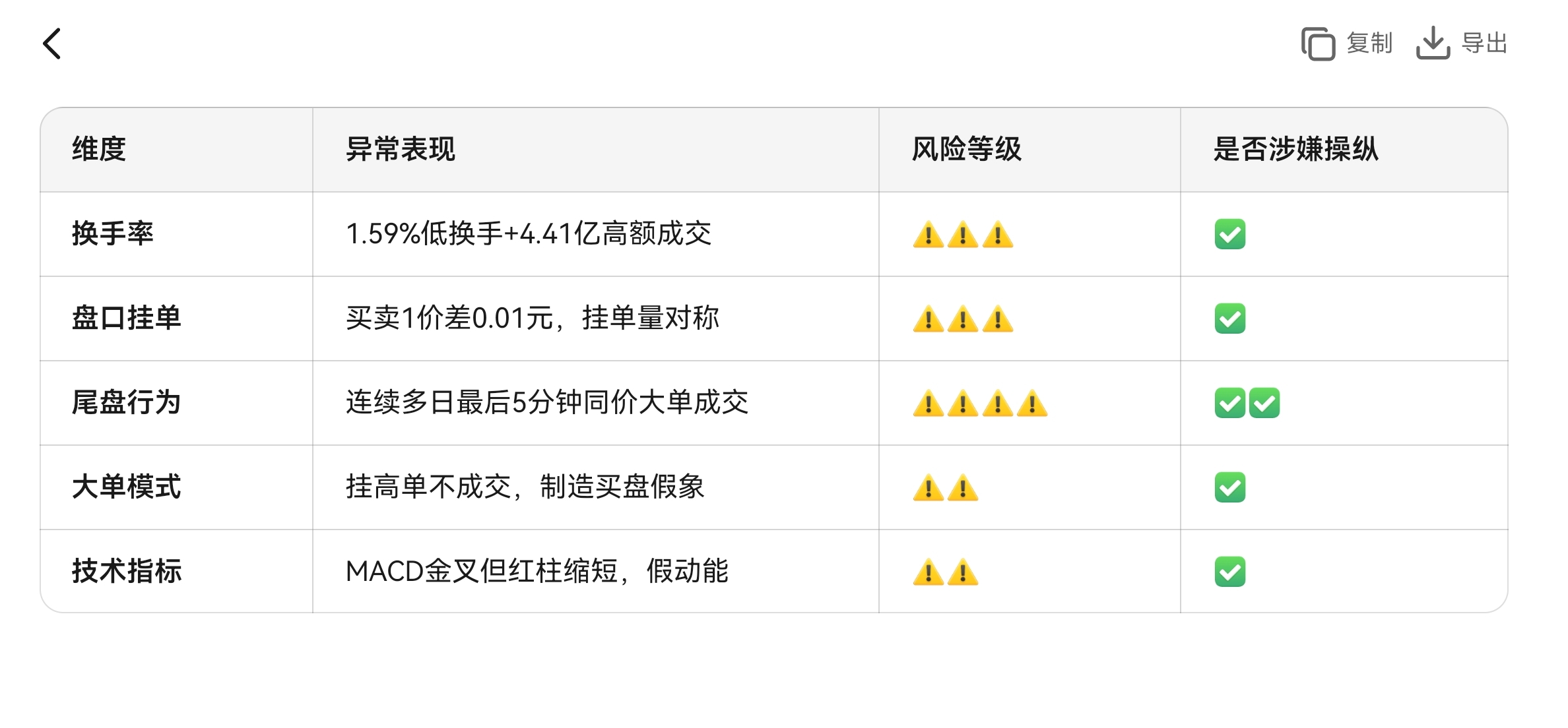五、异常现象:尾盘对倒 + 低换手 + 挂单异常 → “连续多日尾盘同价大单对倒,且换手率低于2%,盘口挂单高度对称”→一旦核实 这是证监会稽查系统中“操纵收盘价”的经典特征模型,一旦被监管扫描到,可直接定性为“市场操纵”。