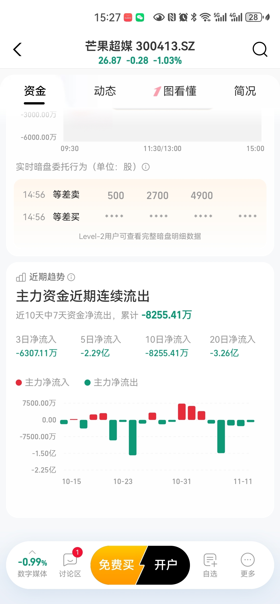 $芒果超媒(SZ300413)$ 网友说几句对他们根本不造成影响,真正影响股票走向的是主力资金,现在大量主力外逃。