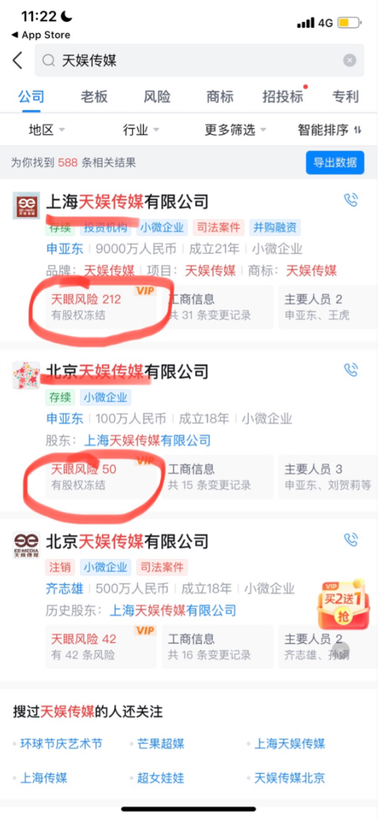 $芒果超媒(SZ300413)$ 董秘能否讲讲,北京天娱传媒和上海天娱传媒公司是有股权冻结吗?如有,请问什么原因呢?与近期股价下跌有关系吗?谢谢
