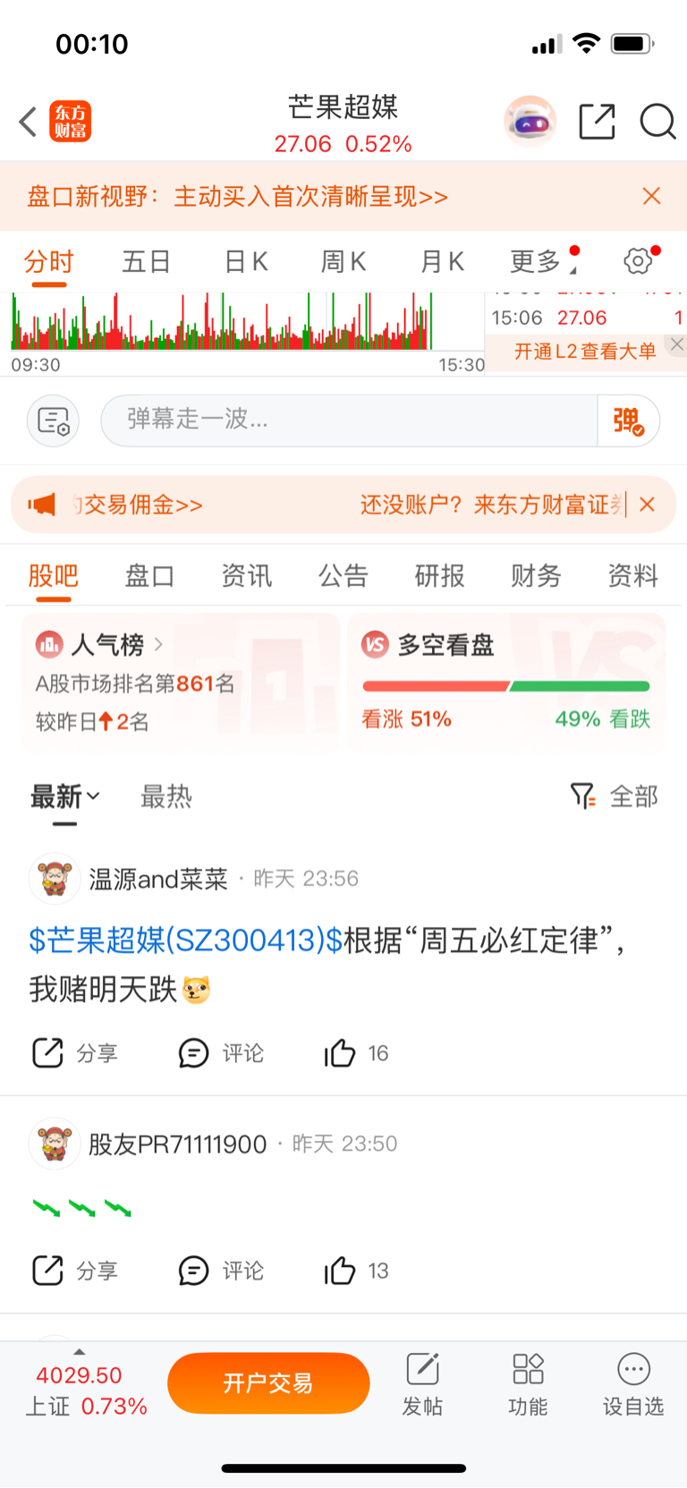 $芒果超媒(SZ300413)$ 没看到看跌在哪,这儿注意到了,居然还有50多看涨,看来水军不少呀