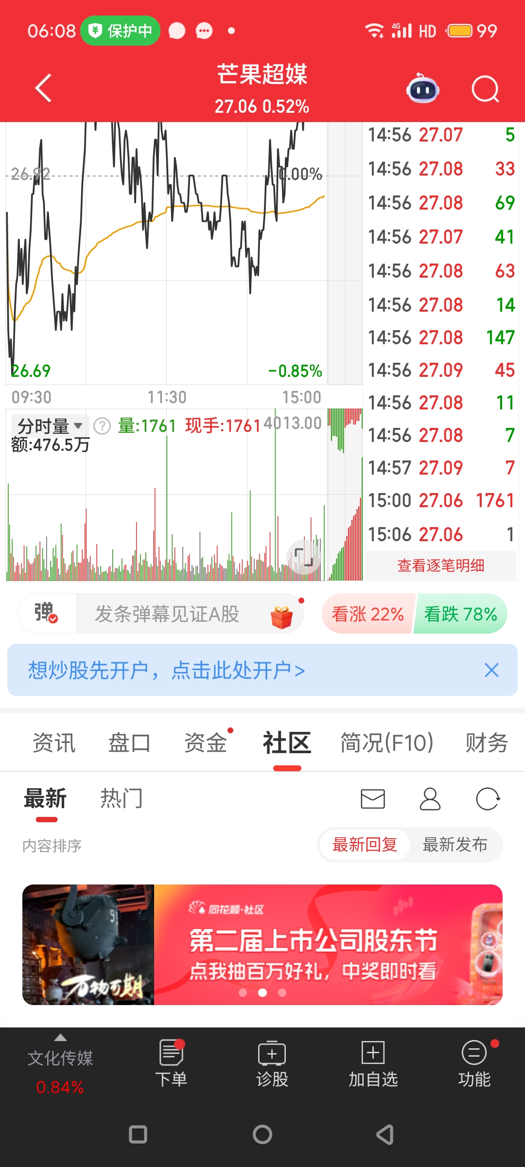 $芒果超媒(SZ300413)$ 同花顺已经22比78了!