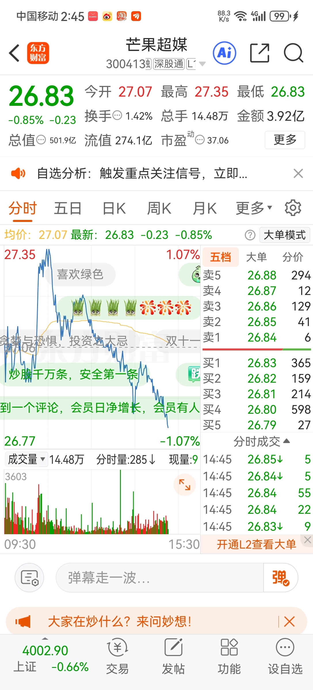 $芒果超媒(SZ300413)$ 哈哈!鹅鹅鹅,这还是没护住啊!又跌回二十六了。