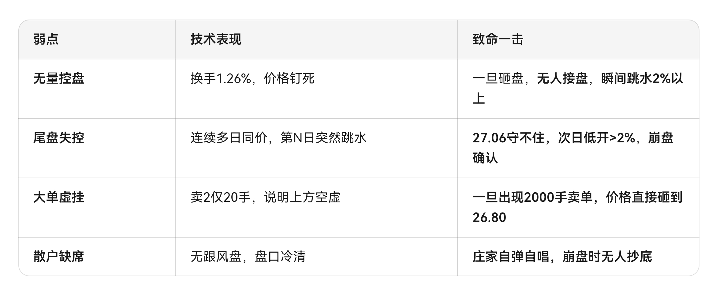 二、连续多日尾盘同价,说明有人在精准控制收盘价,做K线意图明显。 尾盘最后3分钟 —— 价格钉死在27.06元,15:00最后一笔成交:1761手,27.06元,盘后固定价成交:1手,27.06元【左手倒右手典型特征:尾盘大单对倒,价格不变,制造“稳定”假象。】