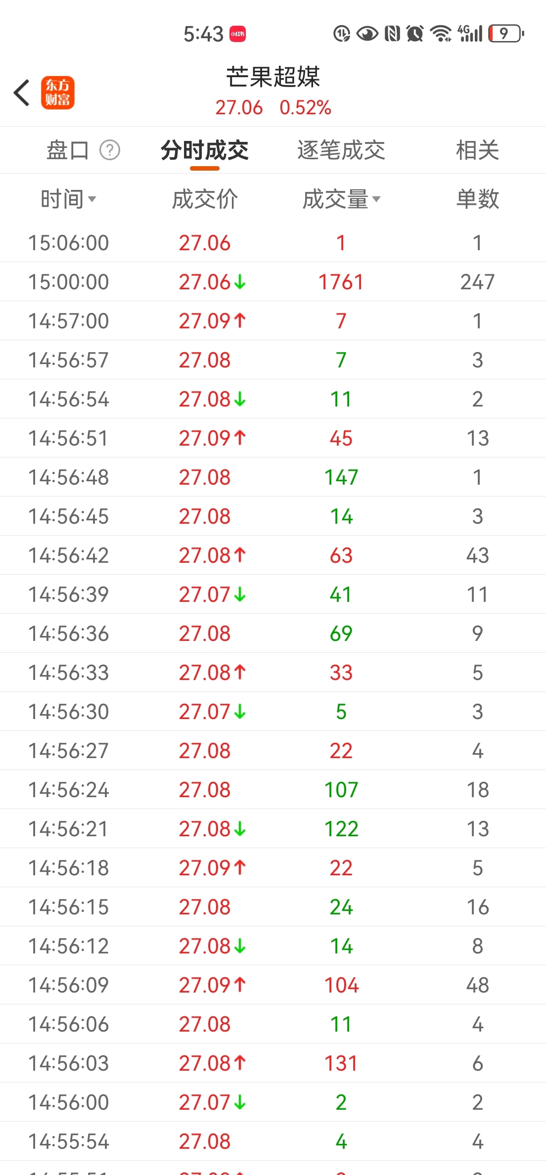$芒果超媒(SZ300413)$今天收盘26.76又应验了!昨天评估的26.8还给多估值了!每天连续最后三分钟都是固价对倒盘!还敢说不是左手倒右手吗?!