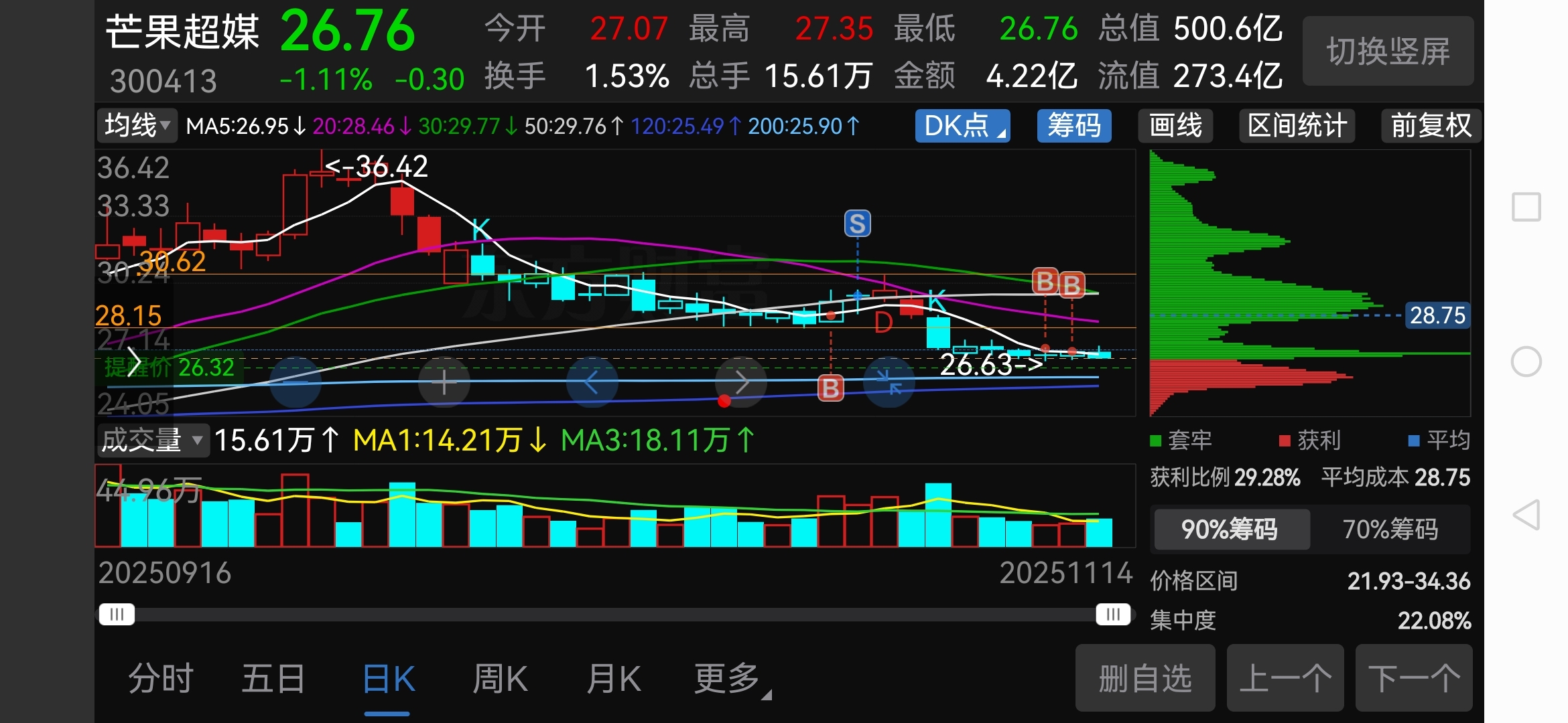 $芒果超媒(SZ300413)$ 今天我来唱多,行情演绎只此,就算一到底,空头也需空中加油,反弹先。打穿 27.13---25.12 支撑箱底,就噗呲一声割肉,博弈终归有代价的,此位置值得干一票。