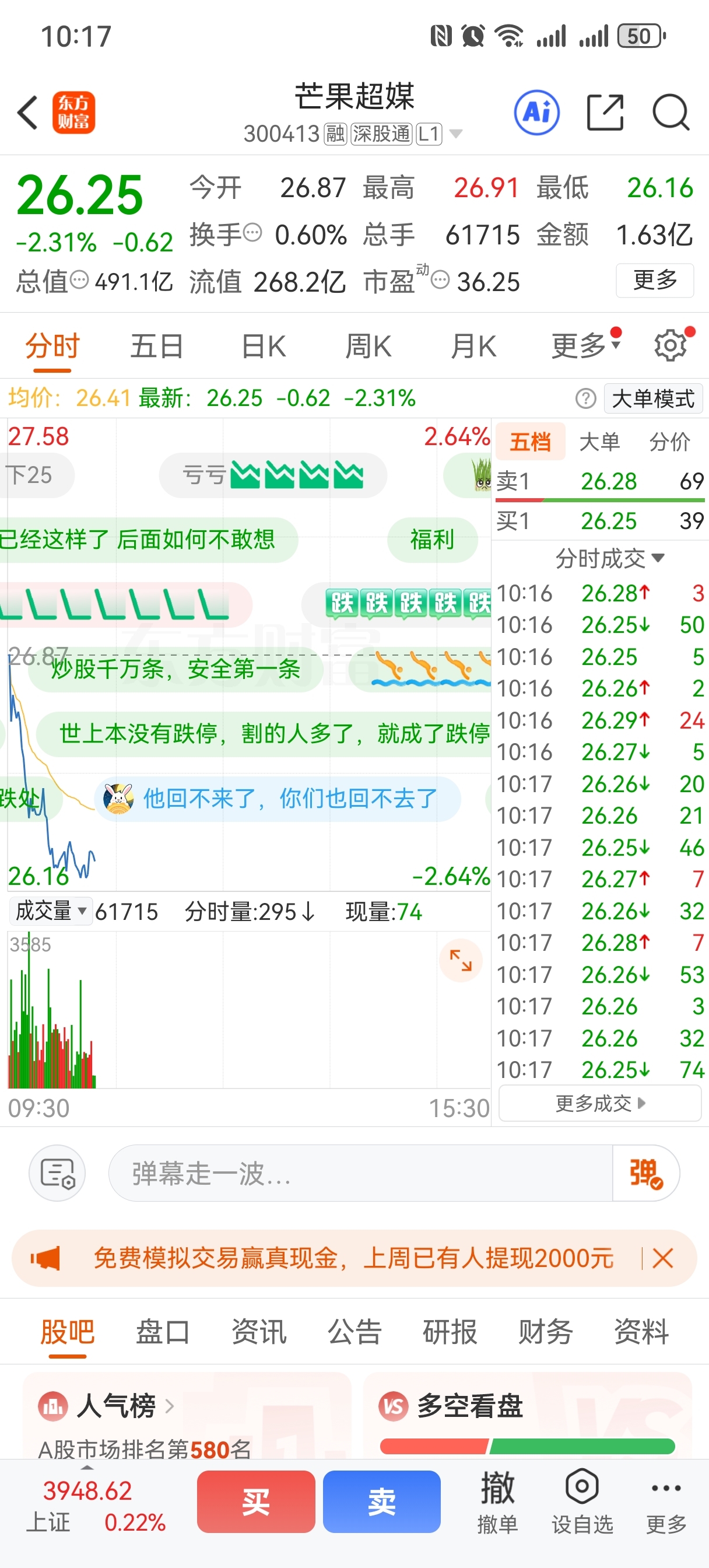 $芒果超媒(SZ300413)$ 可喜可贺,各位同志,终于跌破500亿,来来来继续接着奏乐,接着舞!