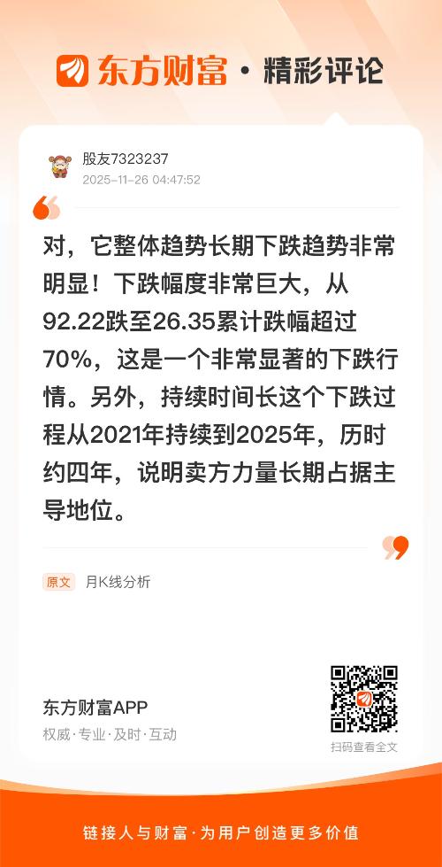 对,它整体趋势长期下跌趋势非常明显!下跌幅度非常巨大,从92.22跌至26.35累计跌幅超过70%,这是一个非常显著的下跌行情。另外,持续时间长这个下跌过程从2021年持续到2025年,历时约四年,说明卖方力量长期占据主导地位。 我在《月K线分析》的评论获得了大家的关注。