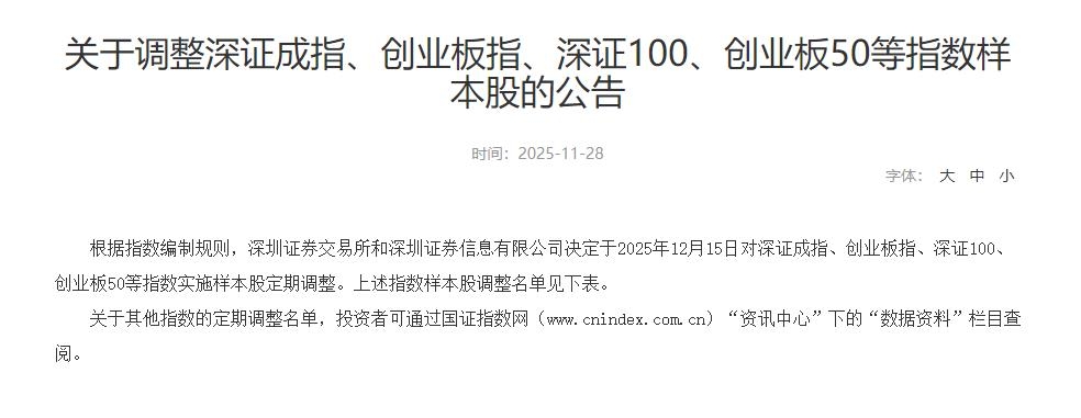 深交所25.11.28日通告12.15日会定期指数调整,芒果被调出。